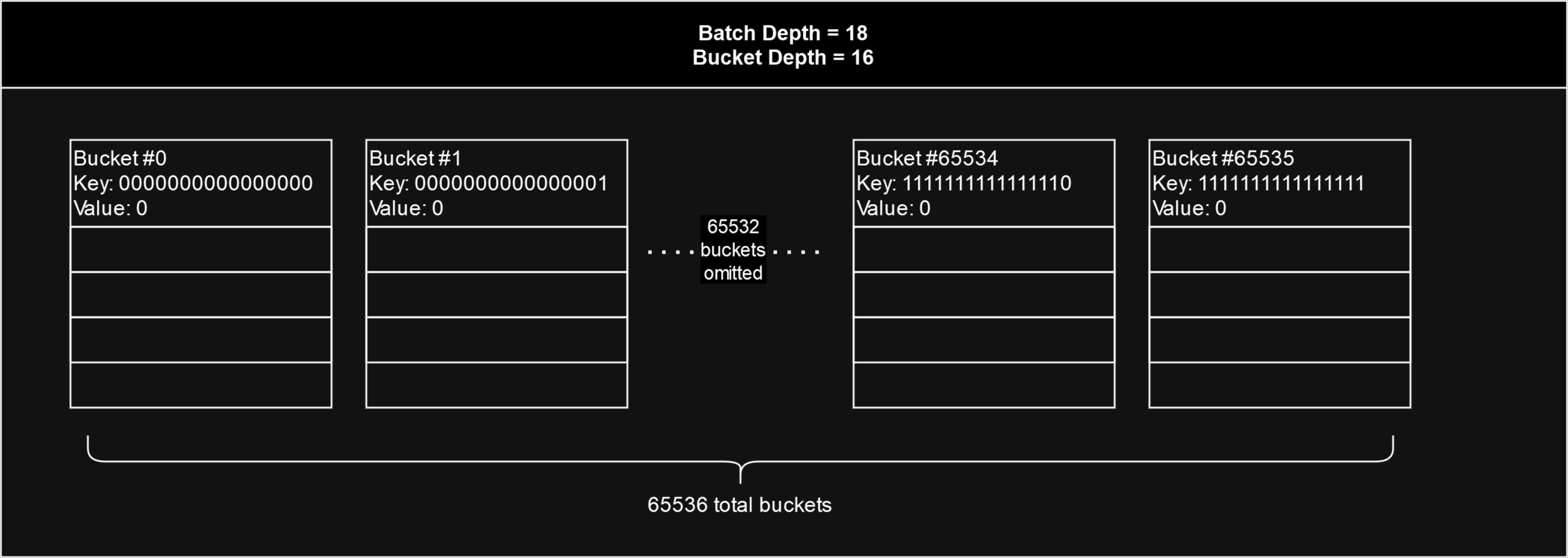 In the diagram below, the batch depth is 18, so there are or 4 slots for each bucket. The utilisation of a batch is simply the highest number of filled slots out of all 65536 entries or "buckets". In this batch, none of the slots in any of the buckets have yet been filled with 4 chunks, so the batch is not yet fully utilised. The most filled slots out of all buckets is 2, so the stamp batch's utilisation is 2 out of 4.