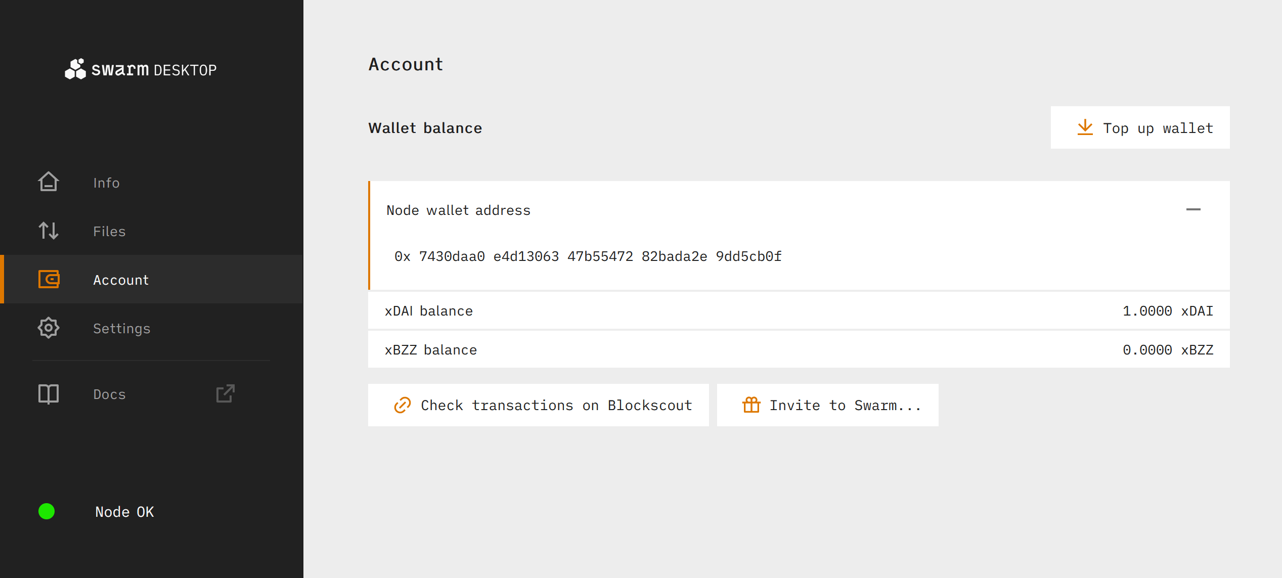 Once you have a few xDAI in your Gnosis Chain address, to fund your Bee node you need to send it from your wallet to your Swarm Desktop wallet. You can find your address from the Account tab of the app.