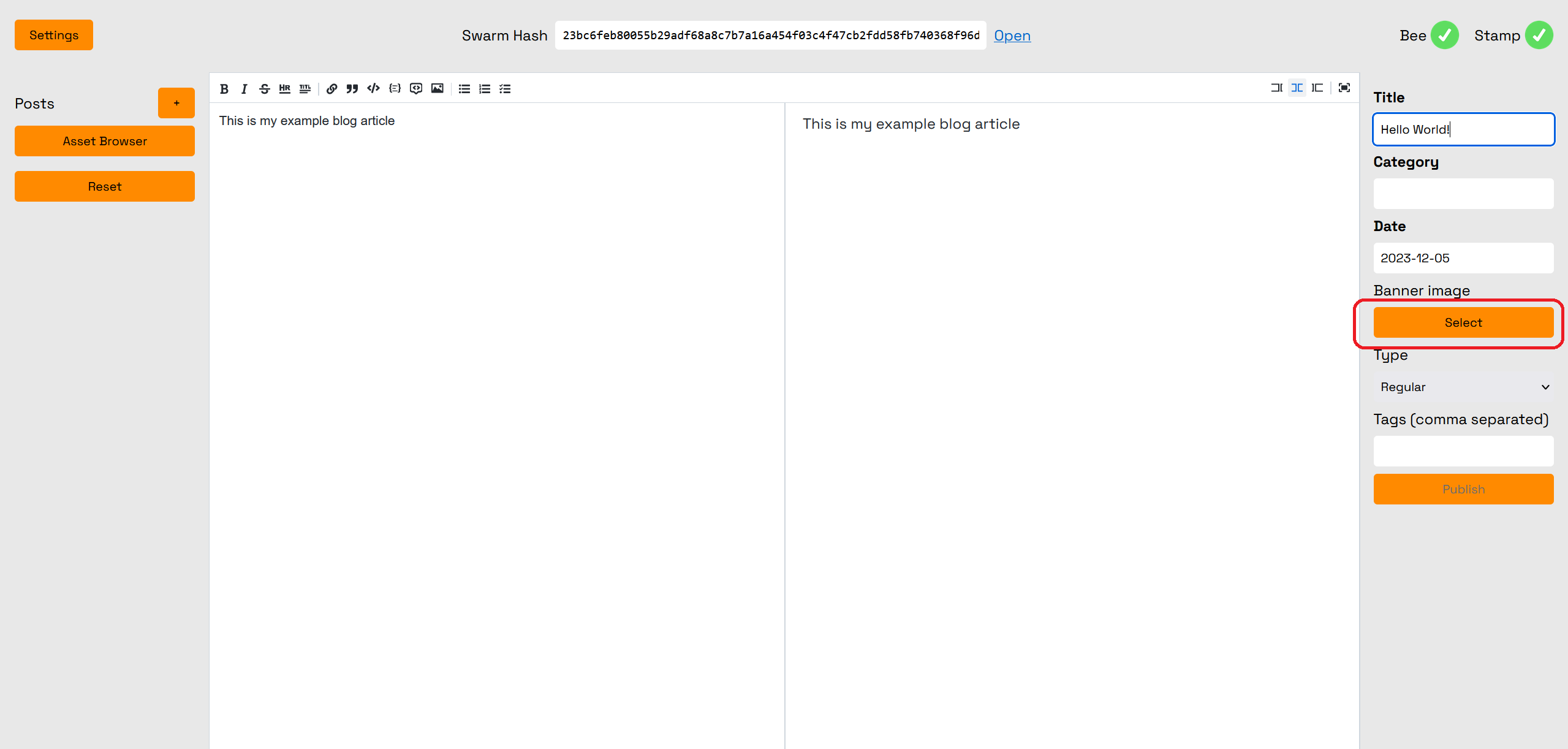To set the banner image which will display as the preview image for your blog, click the "Select" button under the "Banner image" label. This will open up the same Asset Browser mentioned in the section above on adding media, and you may choose an image from there or upload a new one.
