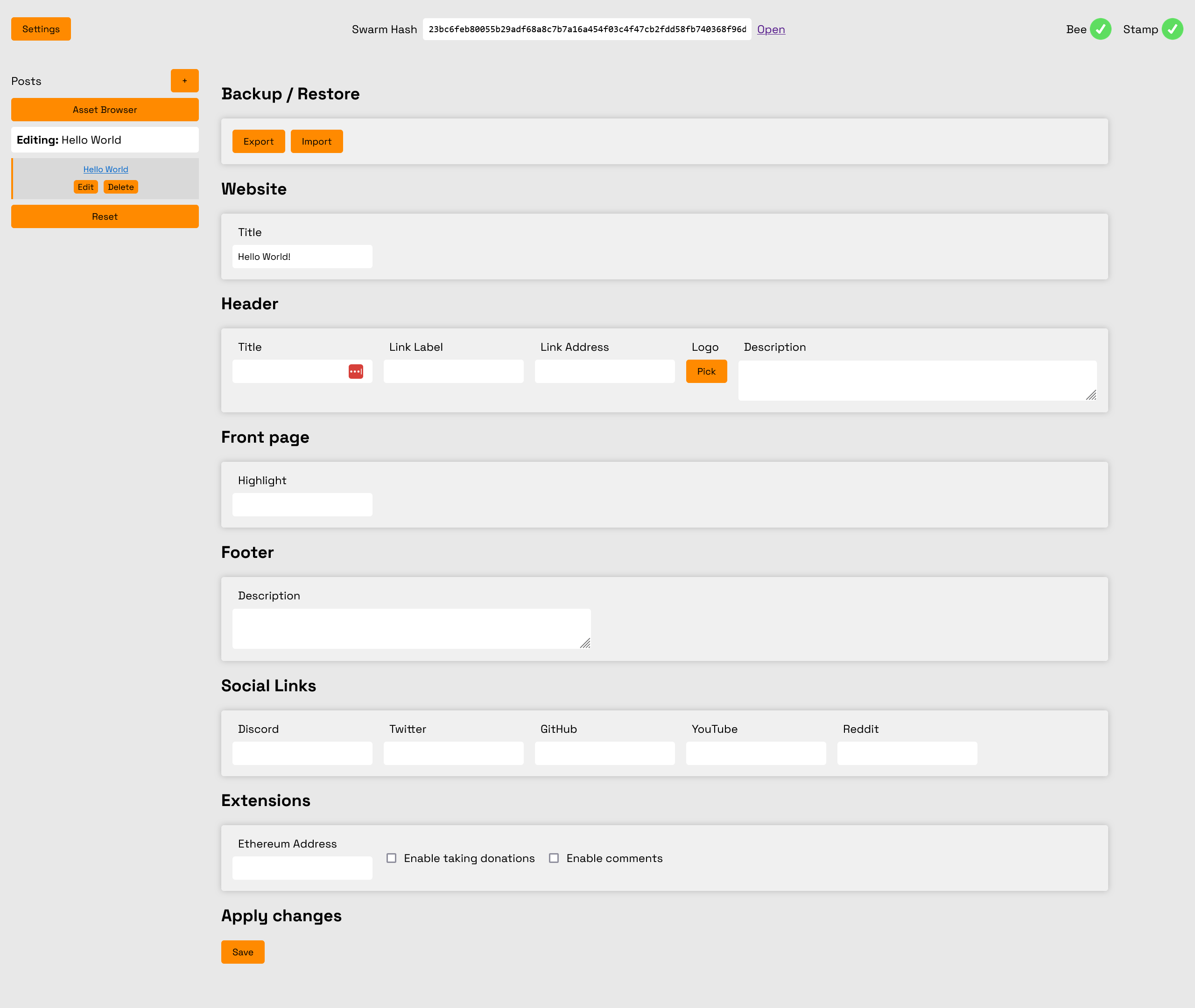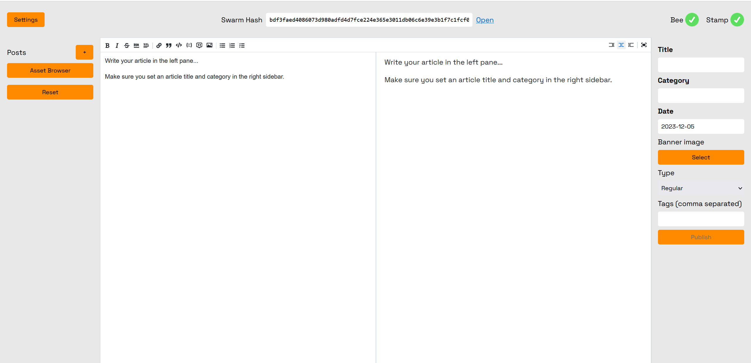 To get started you must first have installed Swarm Desktop and have it running on your computer with a valid stamp batch. Note that your blog will only stay online as long as the postage batch is still valid, therefore you must make sure to stay aware of the postage batch TTL (time to live), and top up your batch regularly in order to keep your content online.